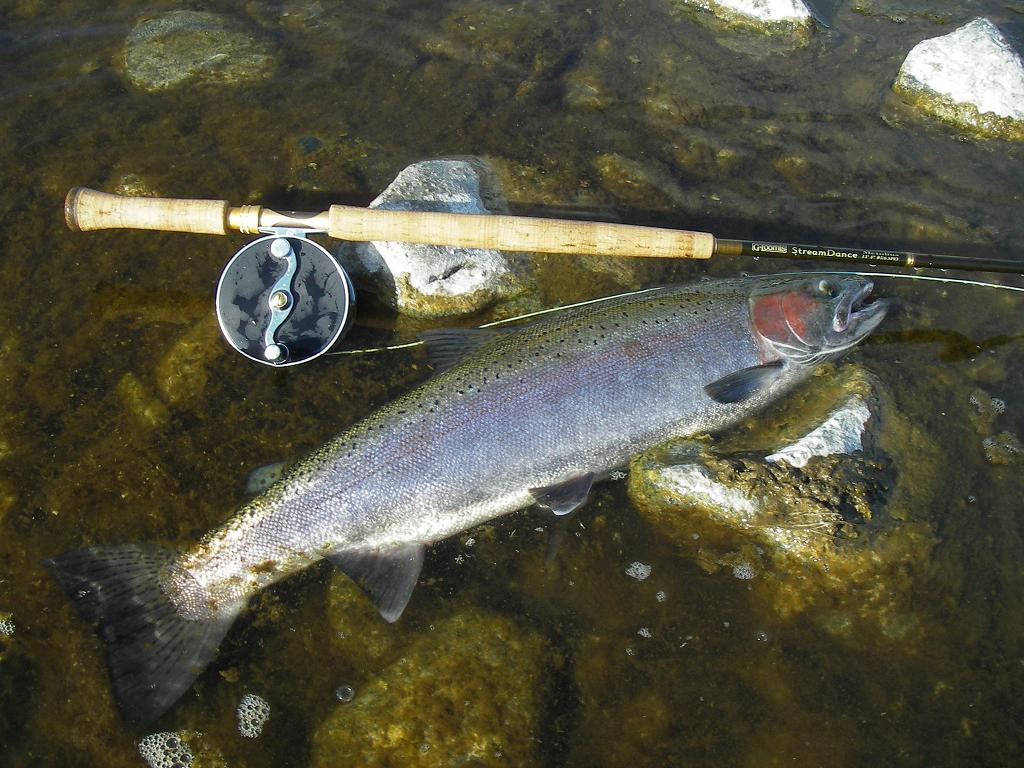As the sun first peeks through the trees on the ridgeline a focused intensity permeates the air. Water vapor oozes everywhere in wispy tendrils that catch the first rays. The river slides purposefully over the cobbles beneath. Everything seems at work. Fish roll up and down the run, some of them splashy affairs that might suggest steelhead. Along the far bank are various slicks and seams that call out for a fly to swing through them. The casts, mends and swings are perfect throughout. Along the way a half pounder is hooked and jumped as the fly swings around on the dangle.