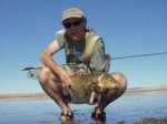 They are ultra spooky in the calm, clear water and the “plink” of a weighted fly can send them off. More often, they seem to slowly amble away rather than flat out bolt. Some fish seem to feed leisurely while others are more intent about it. These are the ones that I will eventually find success on. They won’t move far for a fly, but I did have one jerk its head over about 6″ to grab my tiny rubber legged concoction as i slowly crept it along the bottom. What a sight!! Most of the time, the cast has to literally fall on a dime. Sometimes you can get away with overcasting then slowly stripping in the ‘the zone’ but that risks lining the fish, and if it sees the fly coming at them, it will most likely scurry away. Most memorable fish was one spotted tailing around a small pocket of weeds. I spent several minutes creeping up to accurate casting range. A half dozen casts later the fly sank perfectly, I saw a flick of its head, a puff of mud and I knew it was on. Into the backing it went and a long, slow lumbering run. I was under-prepared with my 7 wt rod. These fish are just too heavy to effectively manage. Next time will be an 8wt – at least.